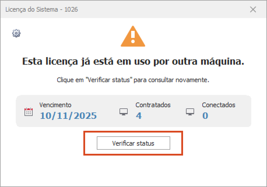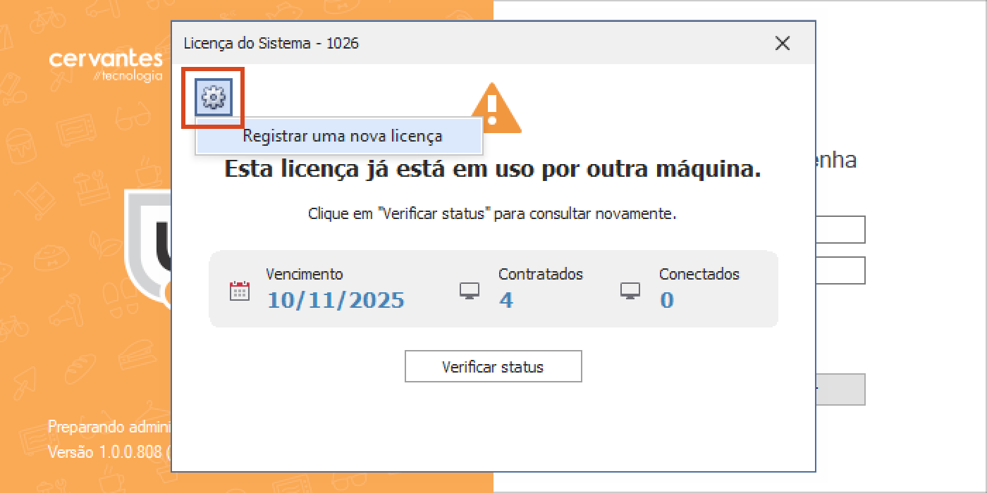Se aparecer a mensagem informando que "Esta licença já está em uso por outra máquina", clique no ícone de engrenagem para Registrar uma nova licença.