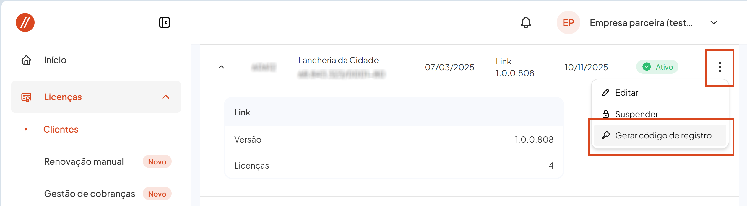 Observação: Você encontra o Código de registro nas informações do cliente no Portal do parceiro. Caso o código já tenha sido consumido, é possível gerar outro clicando no menu (3 pontinhos) do cliente e escolhendo a opção Gerar código de registro.