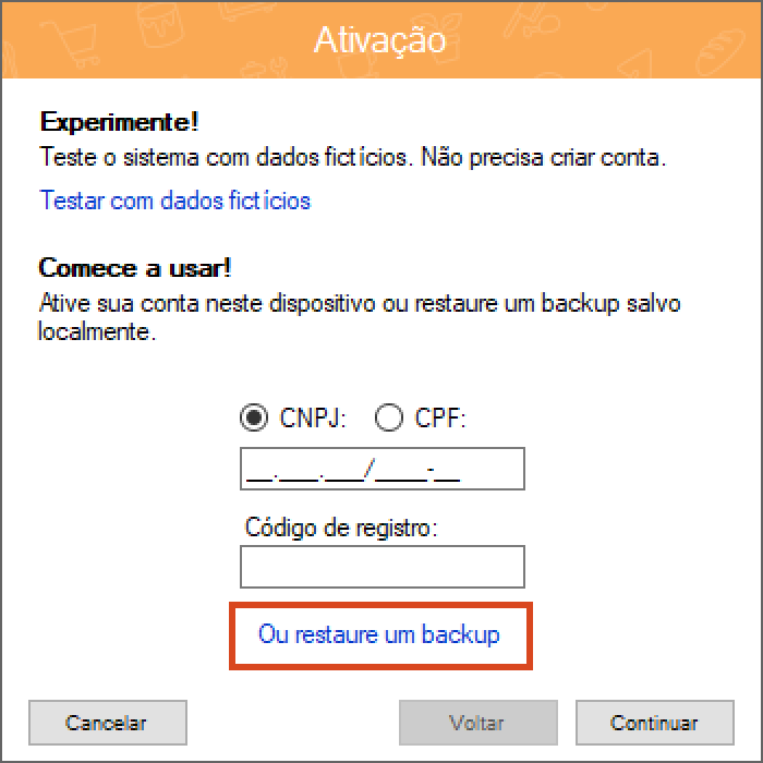 Na tela "Ativação" (imagem abaixo) apenas clique em Ou restaure um backup.