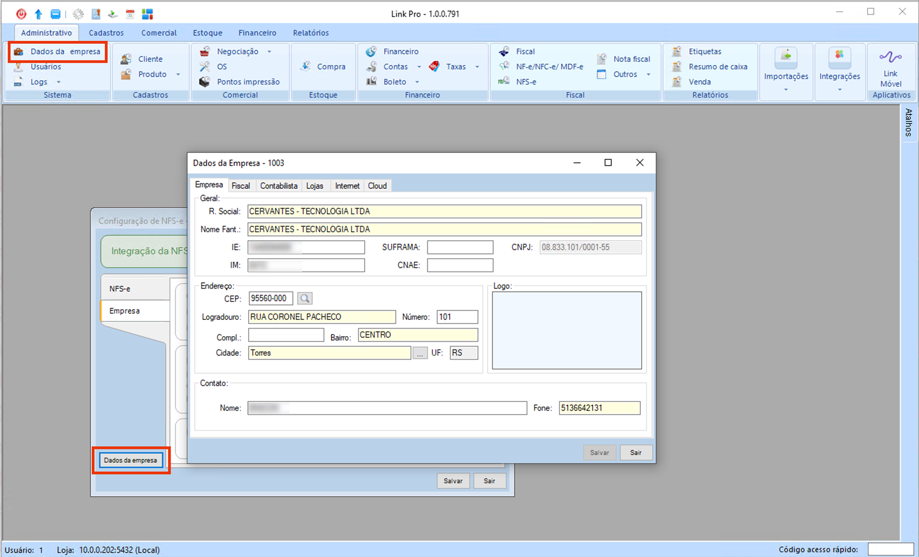 8. Na aba Empresa você pode verificar as informações que estão preenchidas no módulo Dados da empresa, código de acesso rápido "1003". Também existe um botão de atalho para a tela "Dados da empresa" através dessa janela "Configurações de NFS-e", conforme imagem abaixo.