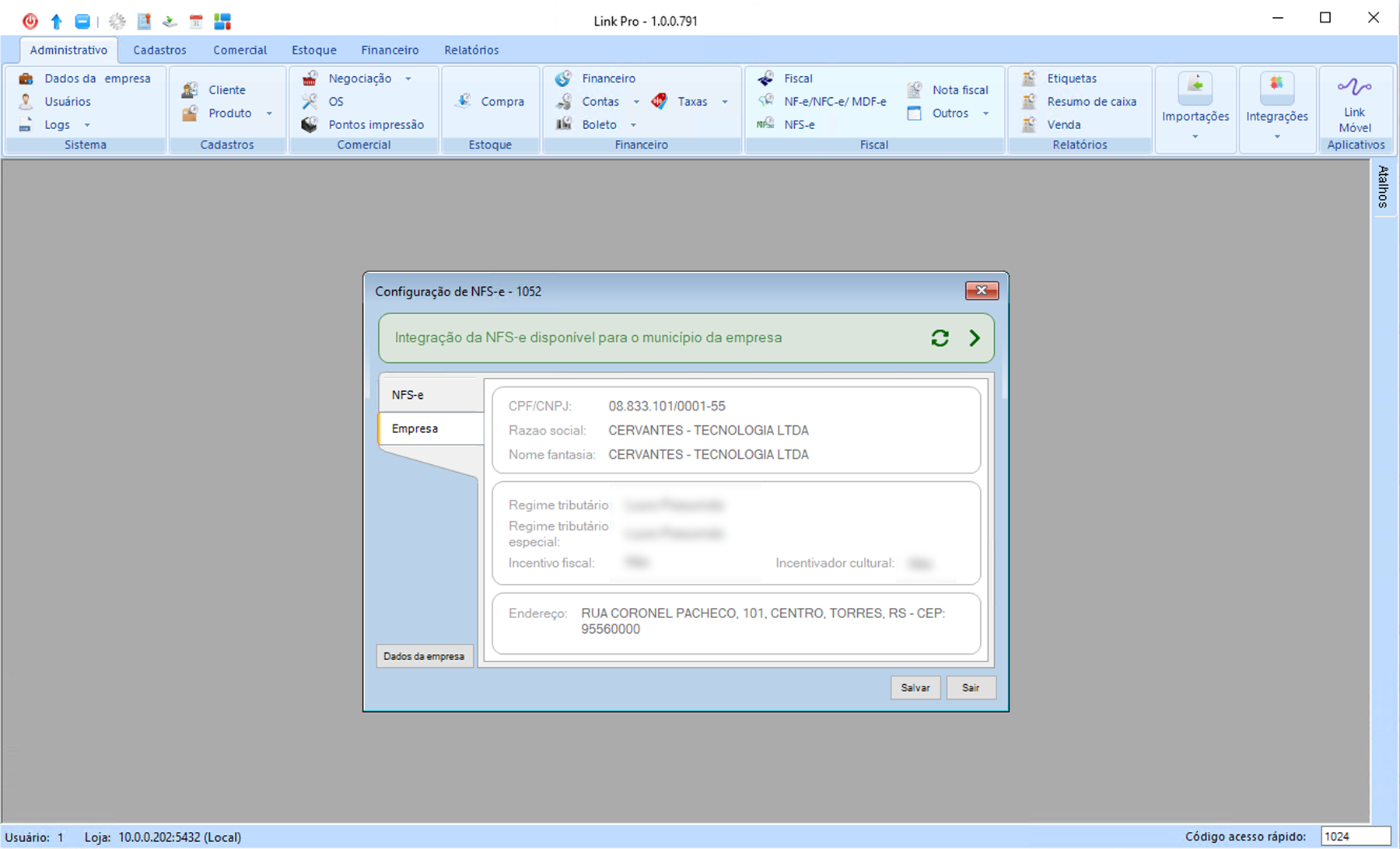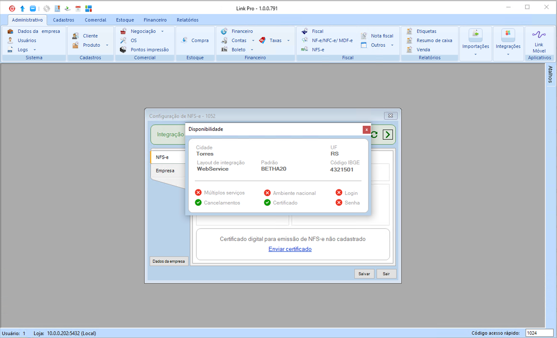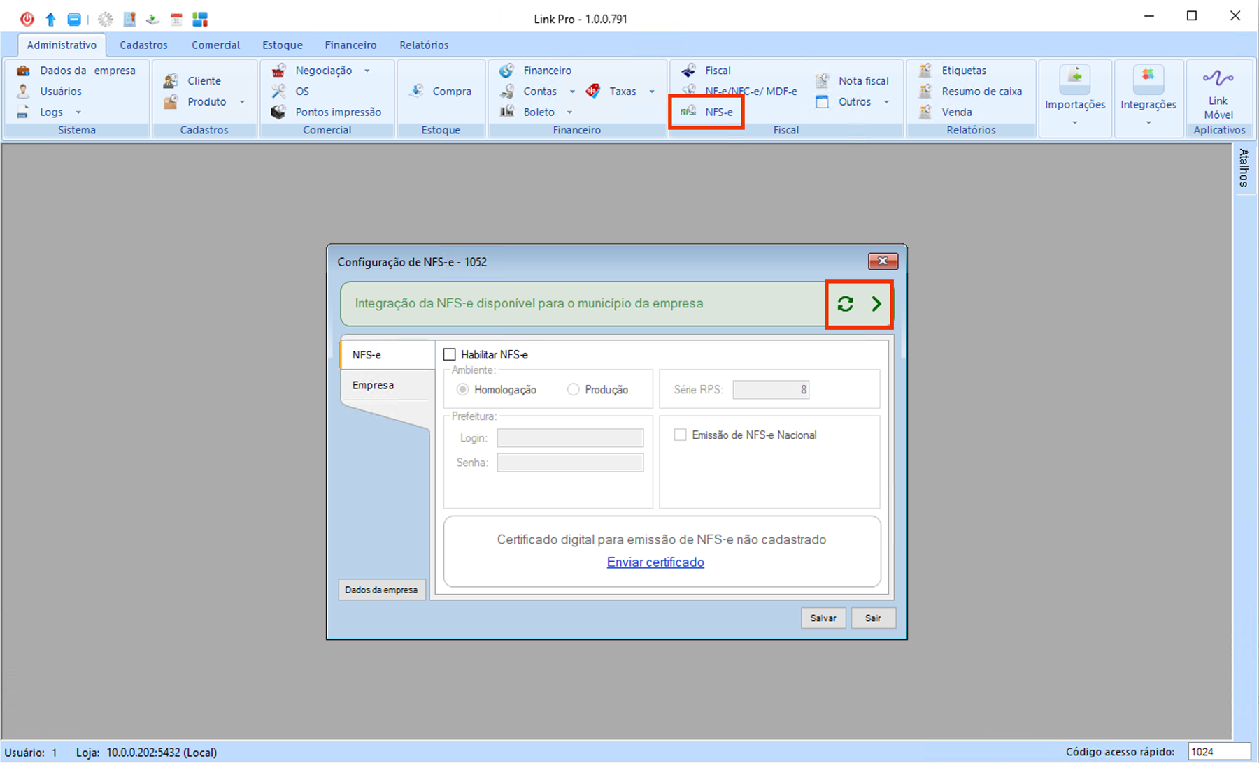 No topo da tela é possível verificar se a integração com a NFS-e está disponível para o município da empresa. Essa verificação é feita com base nos dados preenchidos em "Dados da empresa", na aba "Administrativo" do sistema Link.