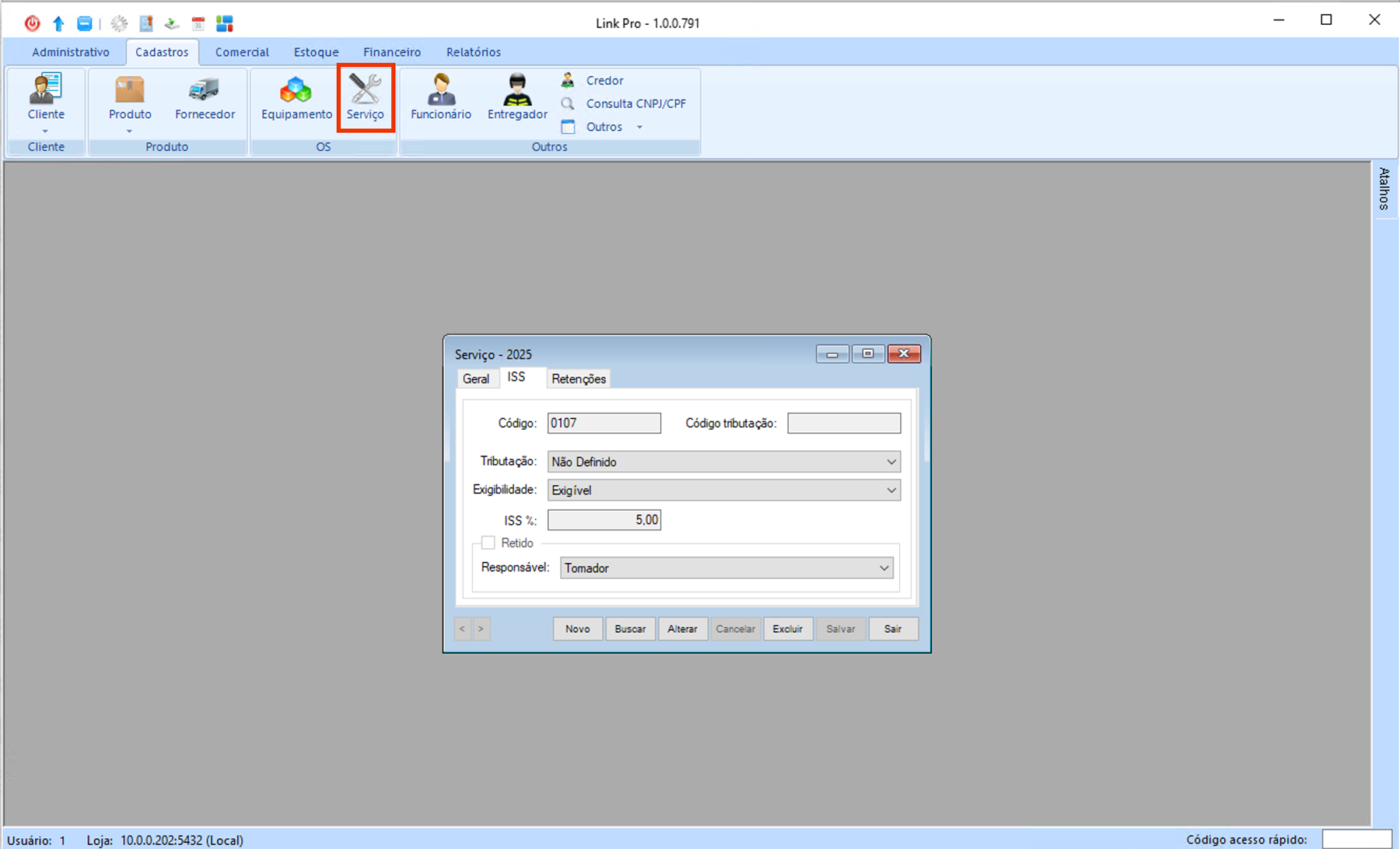 1. Na aba "Cadastros", clique em Serviço, código acesso rápido "2025".